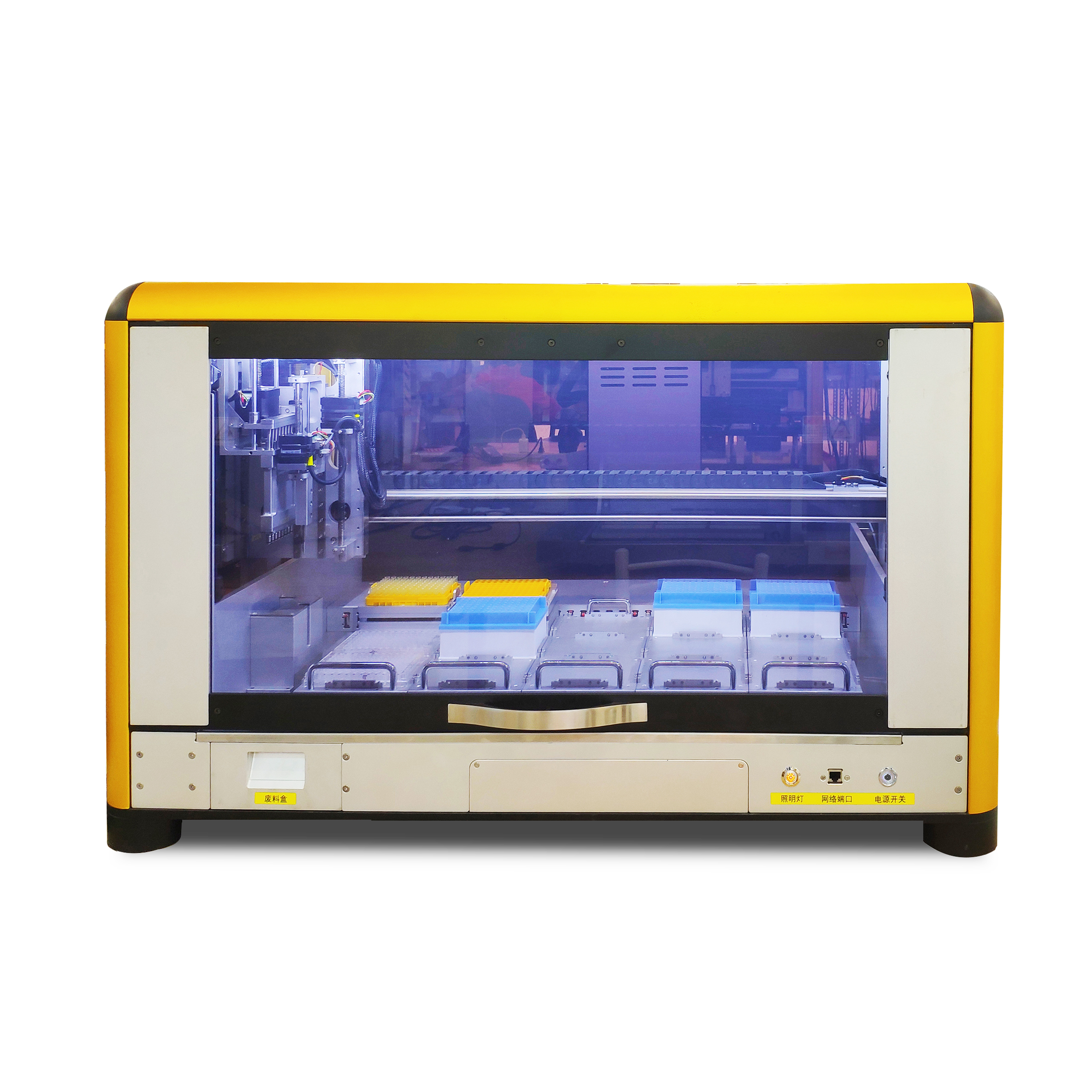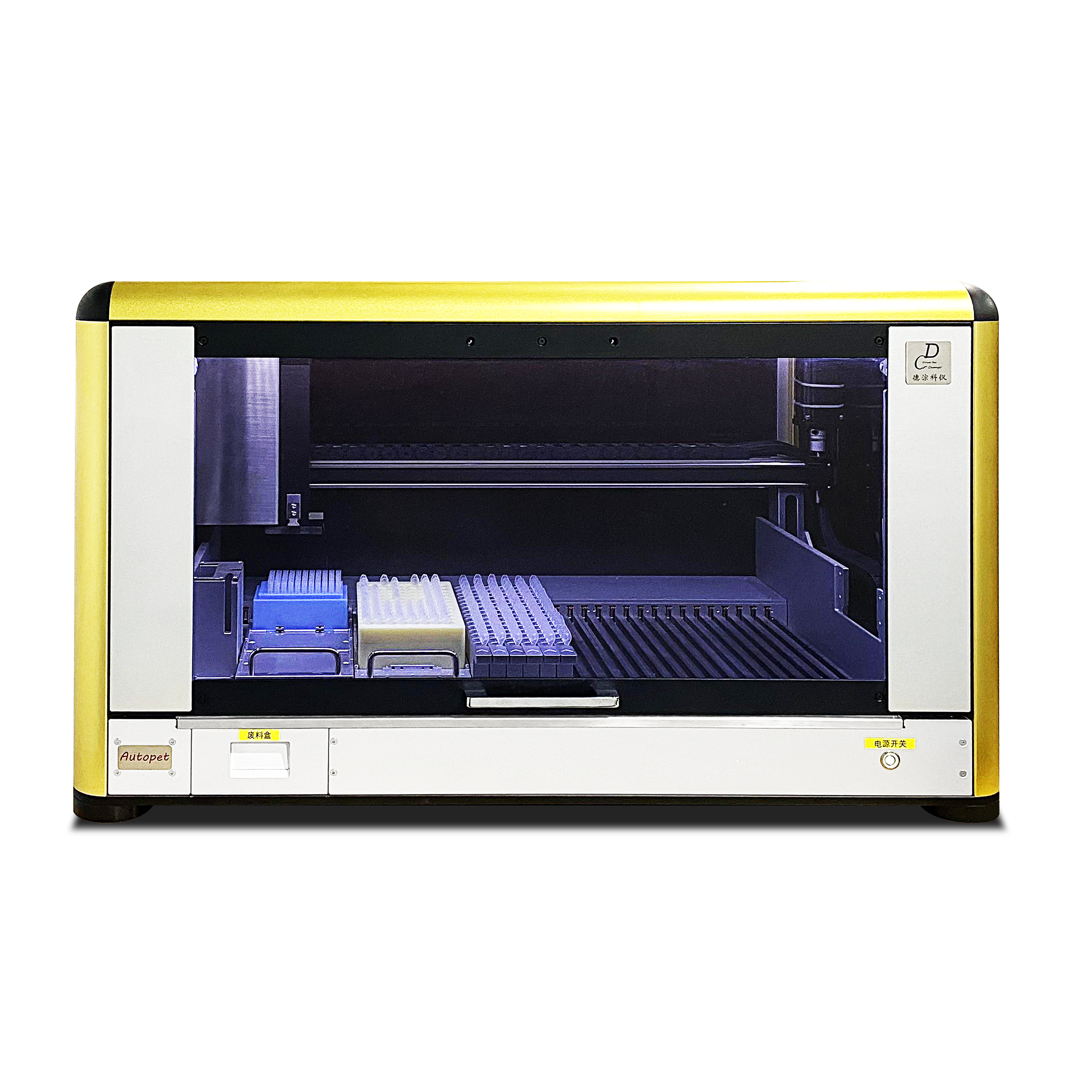 佛山市德淙科学仪器有限公司生产的AUTOPET-1+8型全自动移液工作站提供了开放和固定两种载物台形式。开方式载物台采用模块化、开放式设计理念。通过转换架可随意加载不同规格的板、管、槽等实验器材。最多可承载15板96或384孔板。38条管架。也可实现板、槽等实验容器的给合使用。组合灵活、包容性好固定盘位机型最多可承载15板标准SBS板。也可定制管架使用。可适配扫码模块,震荡、温育、制冷等模块。该机型具有以下特点: